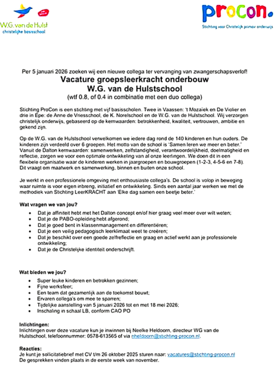 De W.G. van de Hulstschool in Epe zoekt per 5 januari 2026 een nieuwe collega ter vervanging van zwangerschapsverlof!